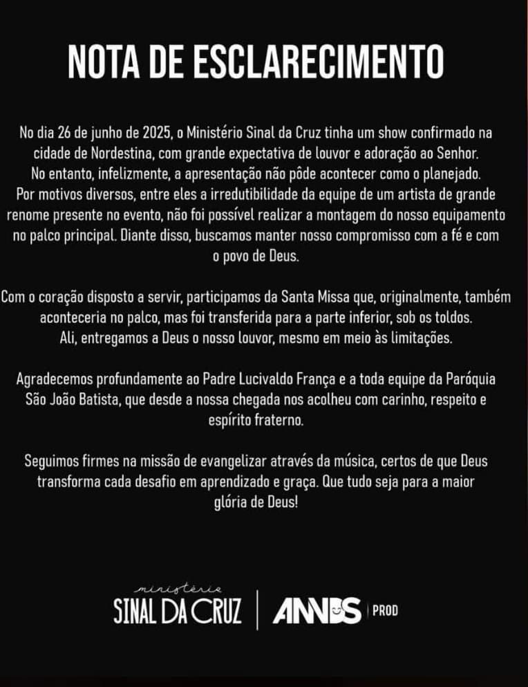 “O Ministério Sinal da Cruz tinha um show confirmado na cidade de Nordestina, com grande expectativa de louvor e adoração ao Senhor. No entanto, infelizmente, a apresentação não pôde acontecer como o planejado”, escreveram em nota.